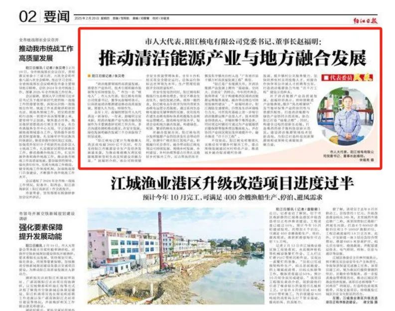 “清洁能源领域的高质量发展,需要在产业协同、技术引领和融合发展等方面持续发力。”作为一名“核电人”和市人大代表,公司党委书记、董事长赵福明表示以高质量清洁能源建设推动高质量发展需要久久为功、持续作为。2月20日,《阳江日报》刊出相关报道,报道全文如下:
