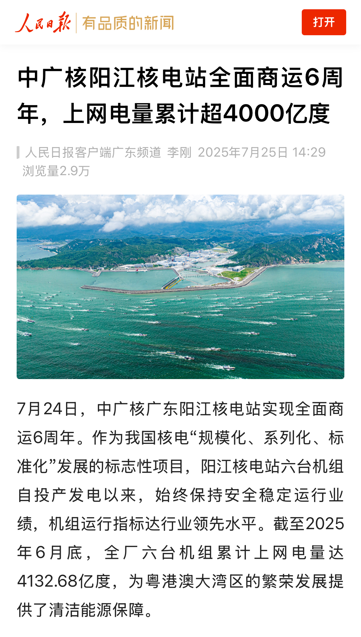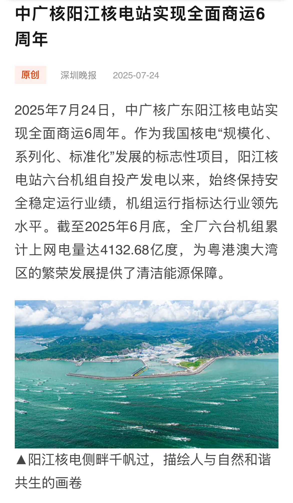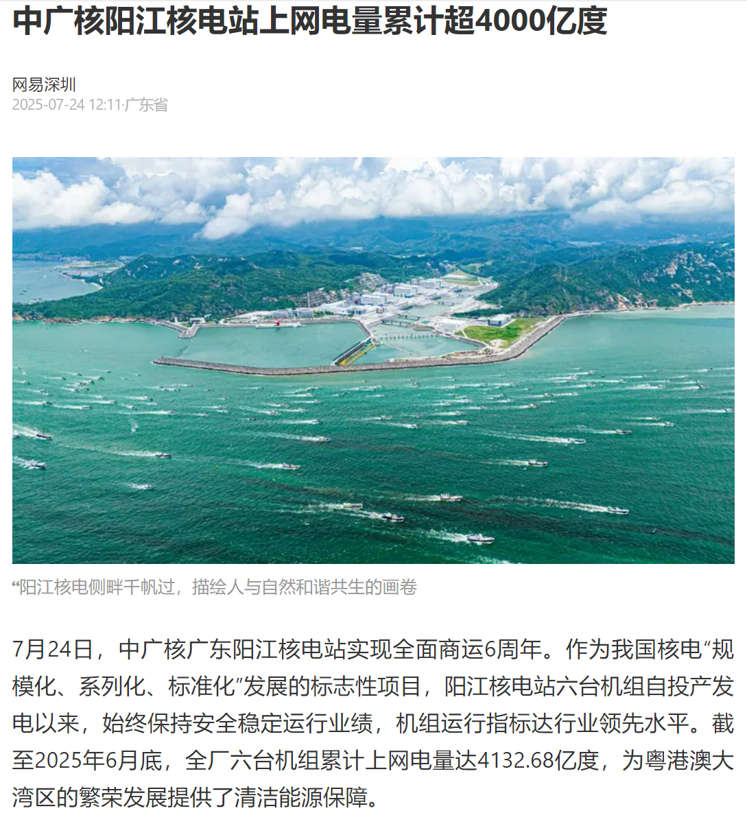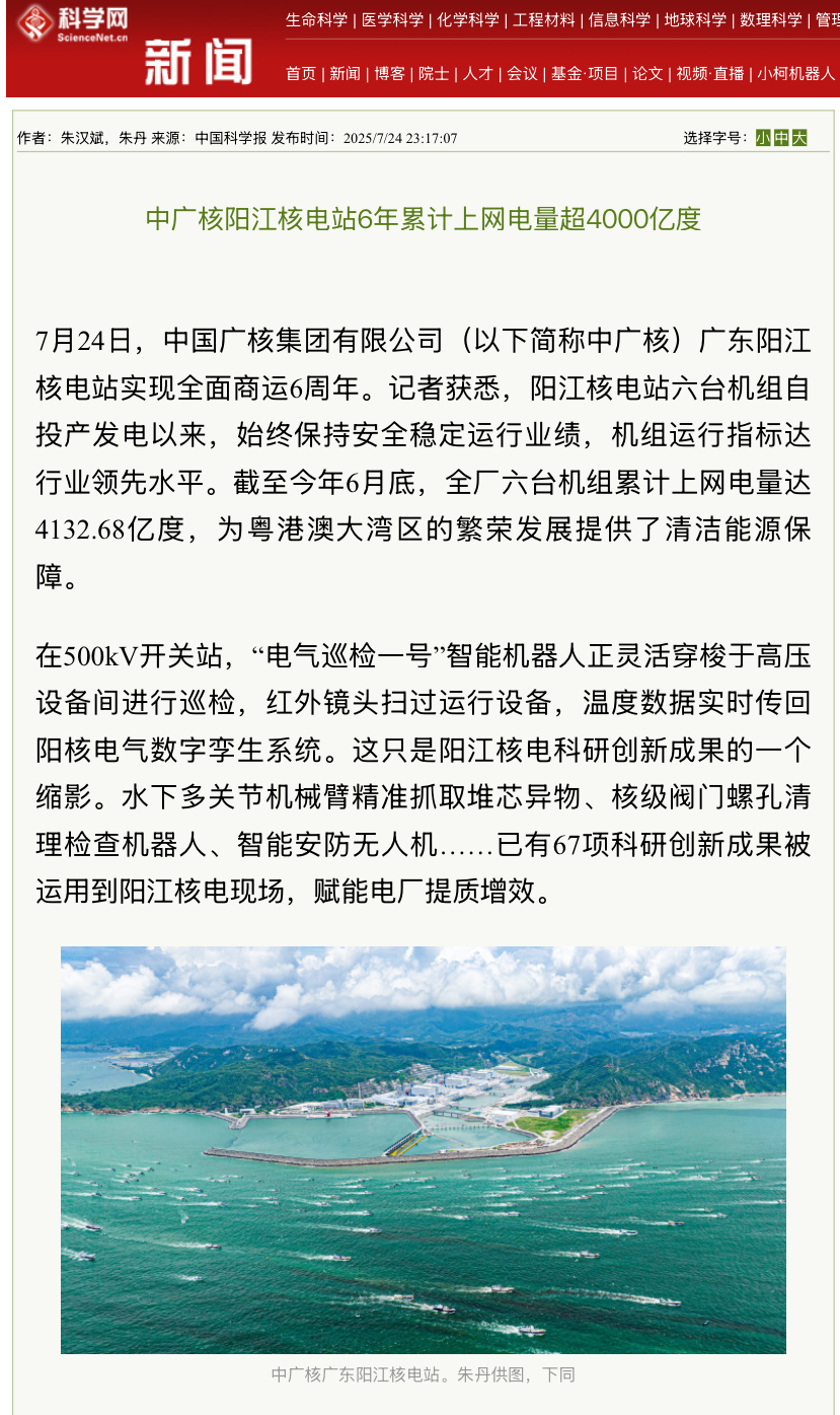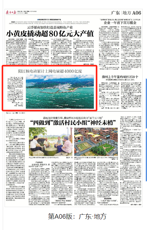 今年7月24日,阳江核电迎来了6台机组全面商运6周年,全基地6台机组实现累计上网电量超4000亿度,人民日报、新华社、央广网、科技日报、中新网等超20家主流媒体以《广东阳江核电站全面商运6年 上网电量累计超4000亿度》《阳江核电站全面商运6周年 上网电量累计超4000亿度》等为题,进行聚焦报道。