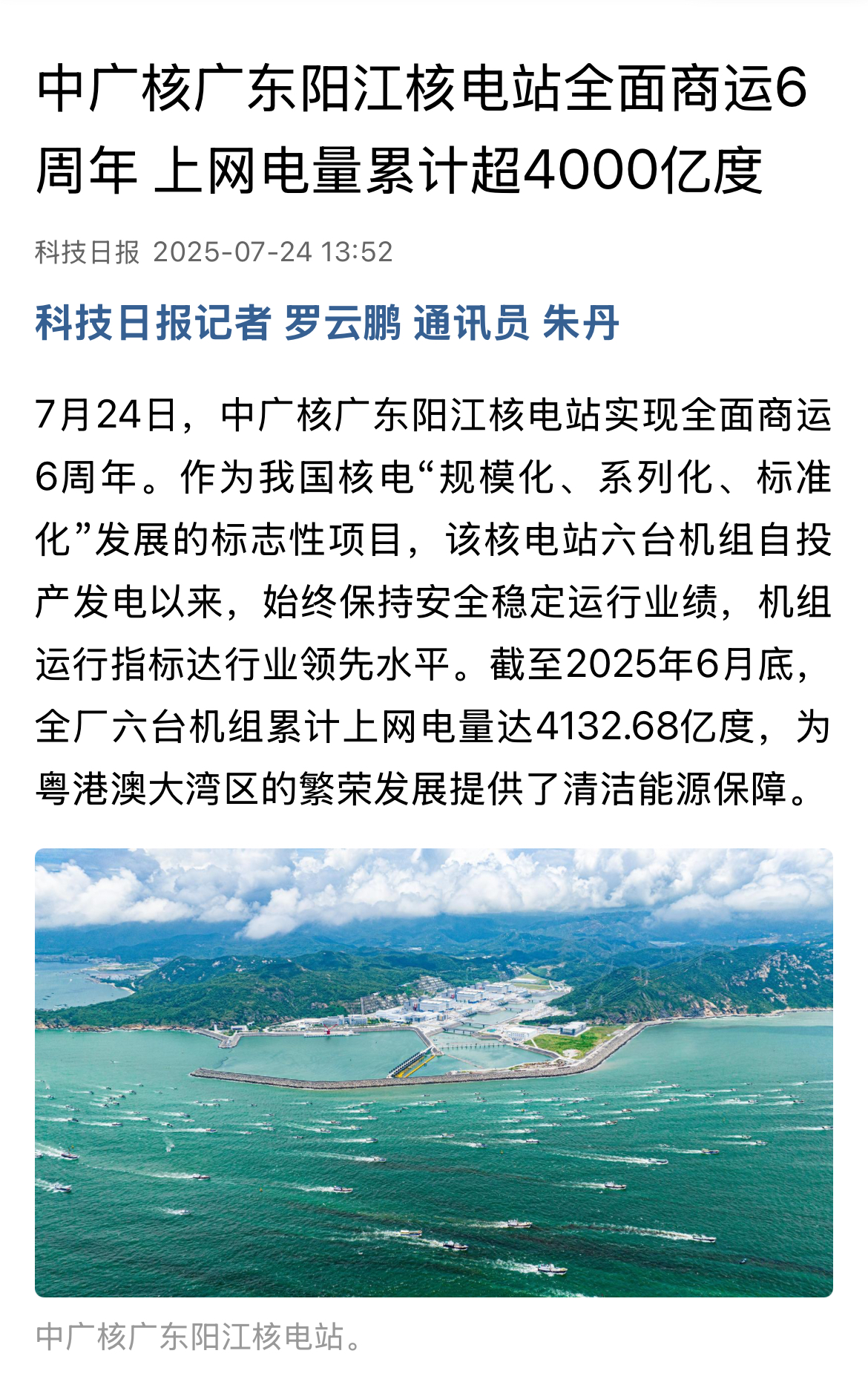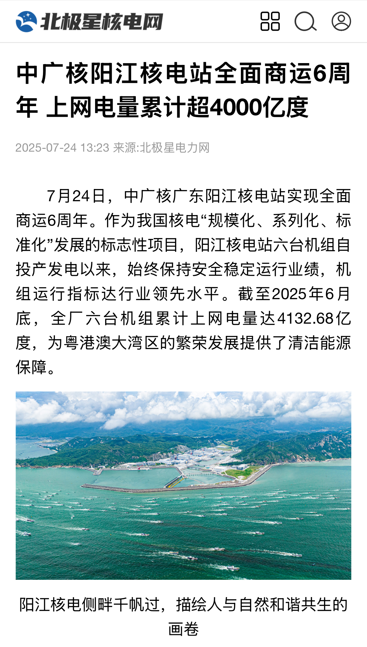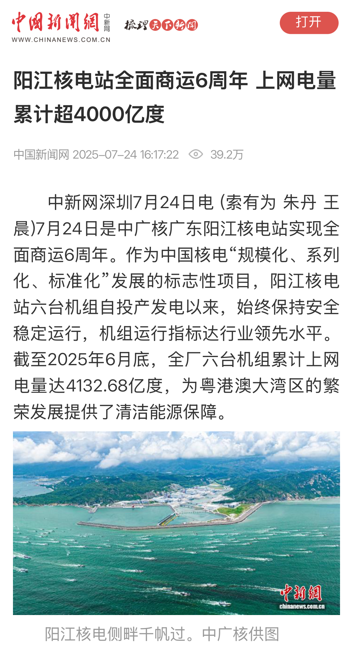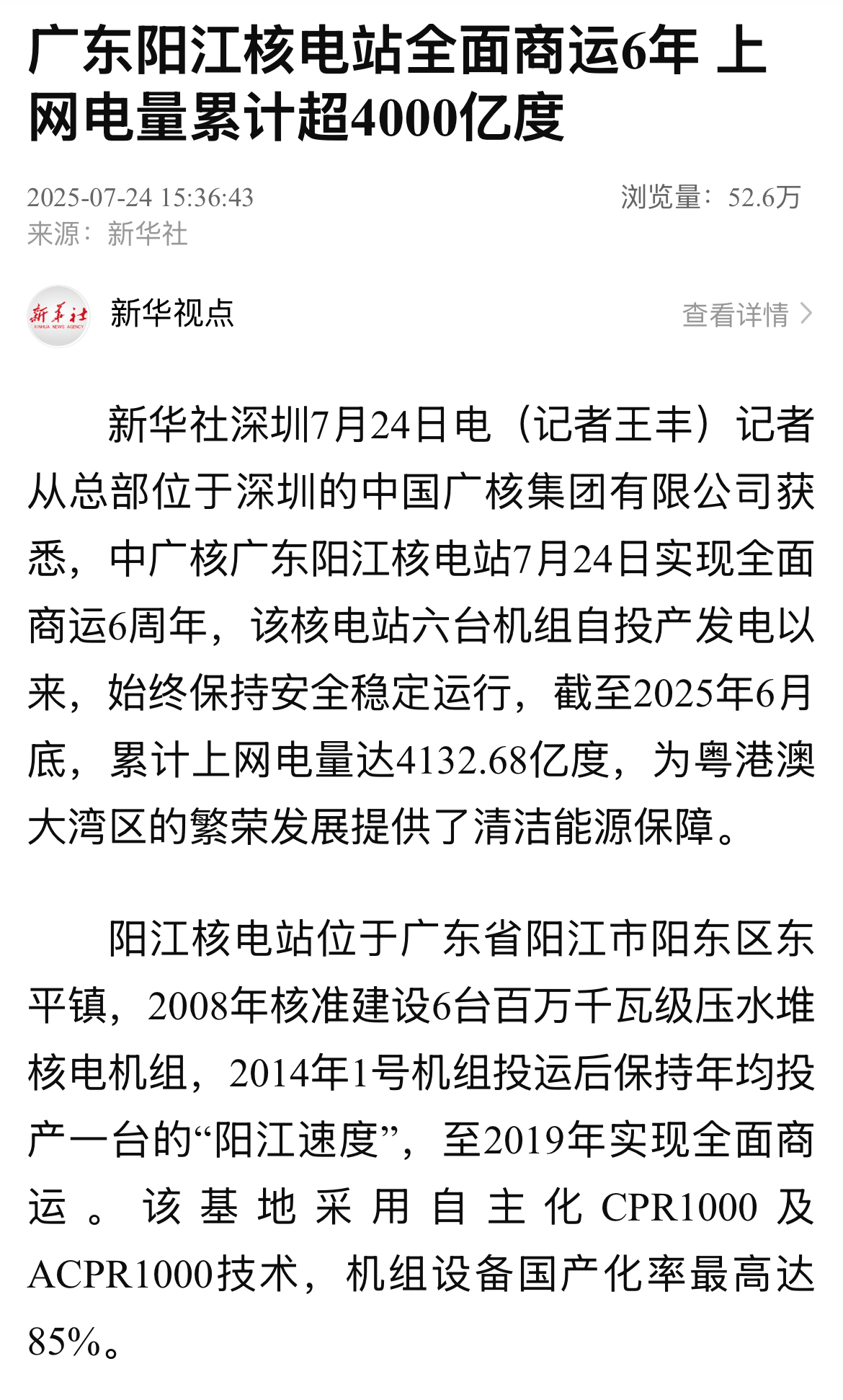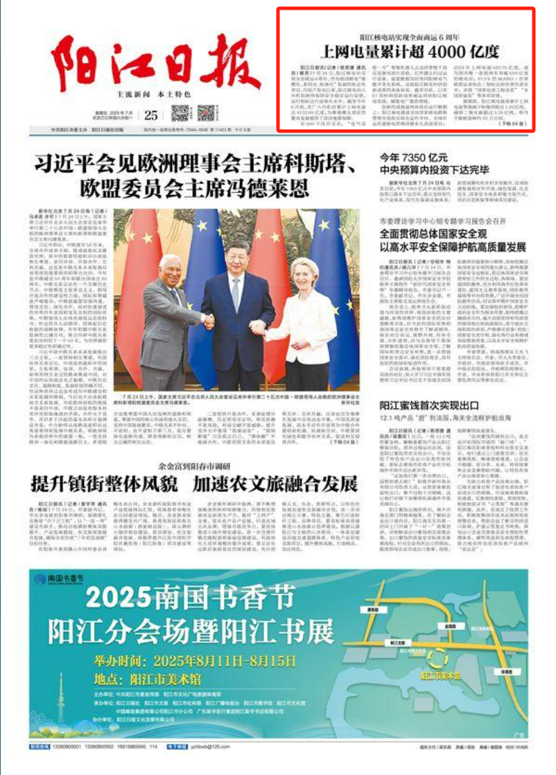 今年7月24日,阳江核电迎来了6台机组全面商运6周年,全基地6台机组实现累计上网电量超4000亿度,人民日报、新华社、央广网、科技日报、中新网等超20家主流媒体以《广东阳江核电站全面商运6年 上网电量累计超4000亿度》《阳江核电站全面商运6周年 上网电量累计超4000亿度》等为题,进行聚焦报道。