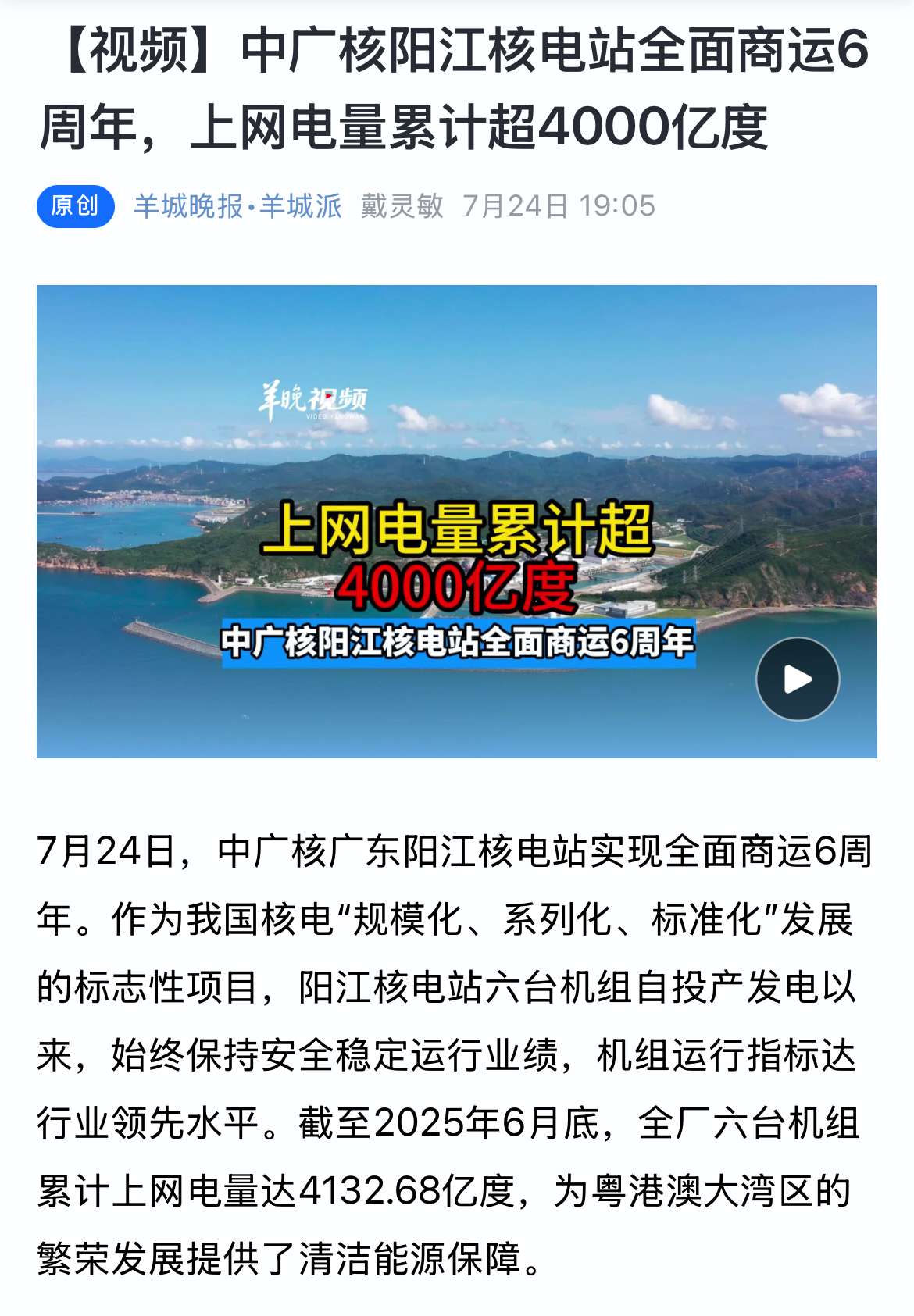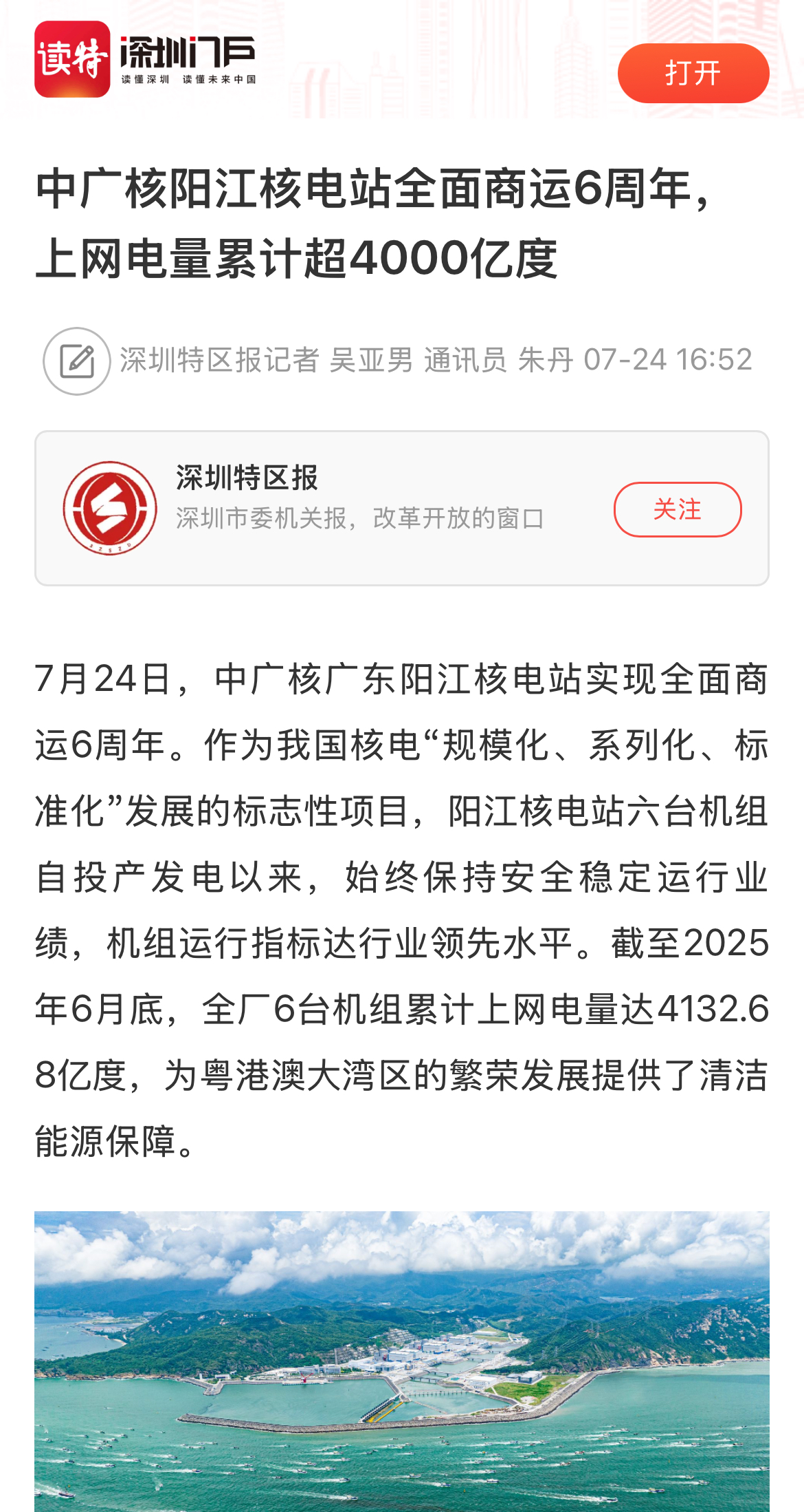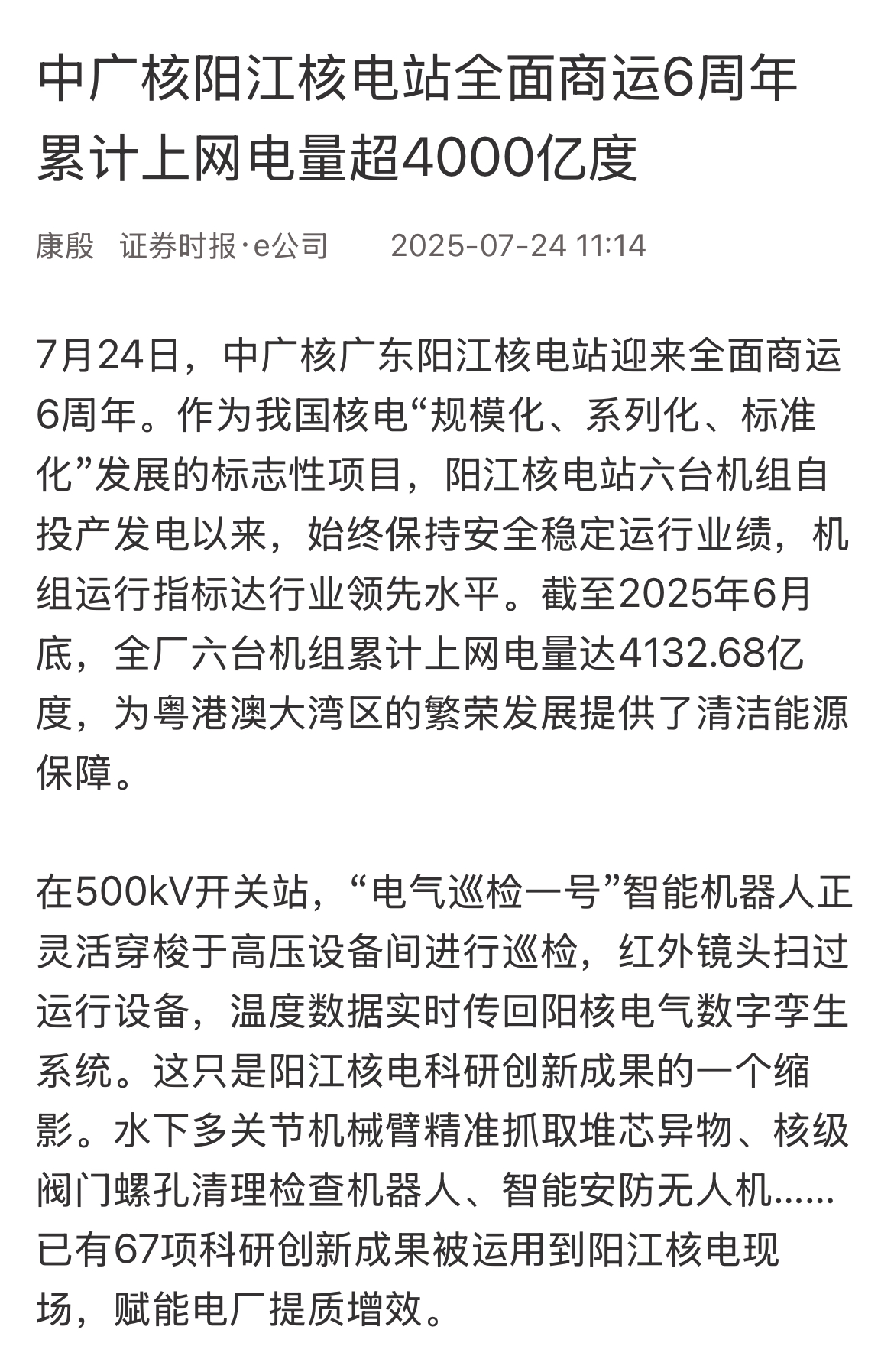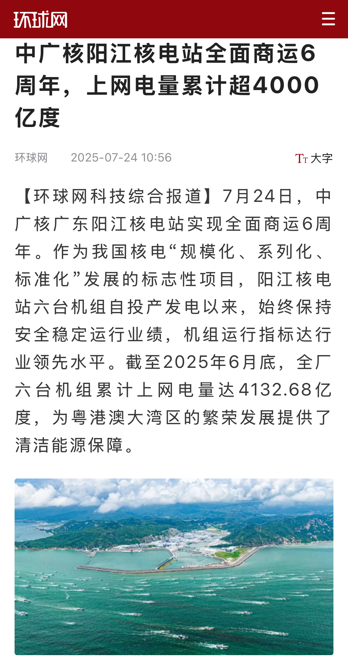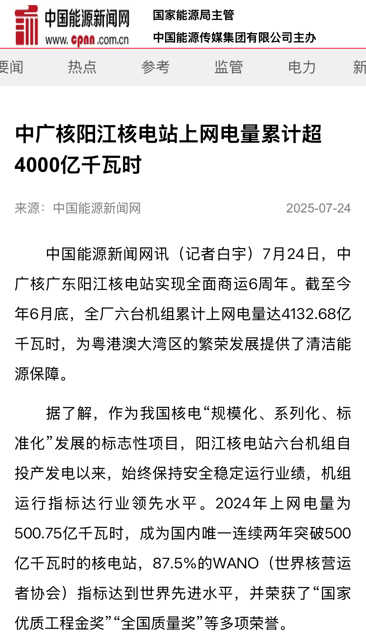 今年7月24日,阳江核电迎来了6台机组全面商运6周年,全基地6台机组实现累计上网电量超4000亿度,人民日报、新华社、央广网、科技日报、中新网等超20家主流媒体以《广东阳江核电站全面商运6年 上网电量累计超4000亿度》《阳江核电站全面商运6周年 上网电量累计超4000亿度》等为题,进行聚焦报道。