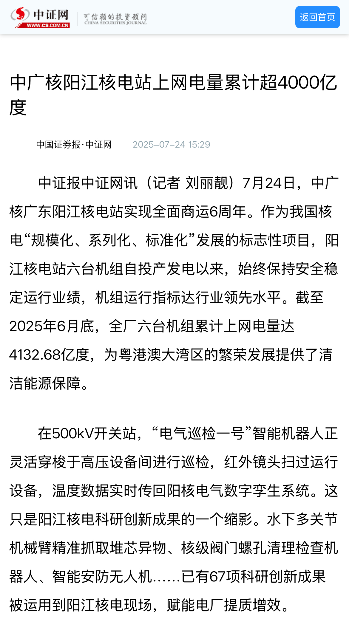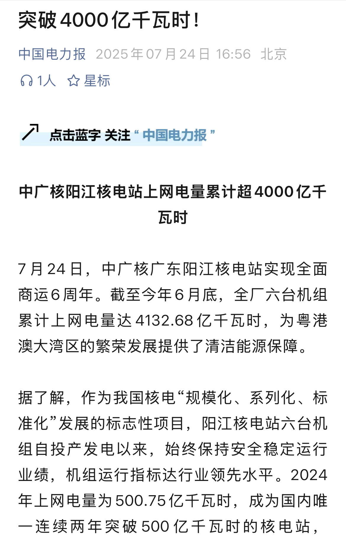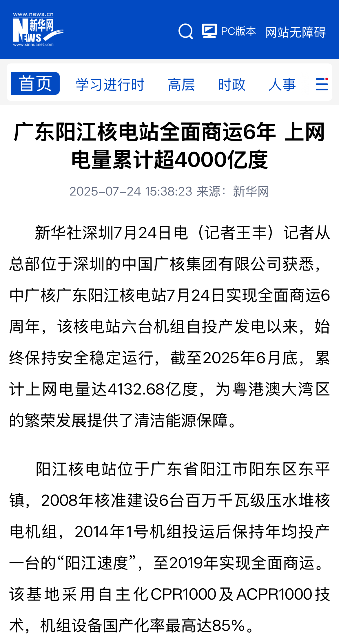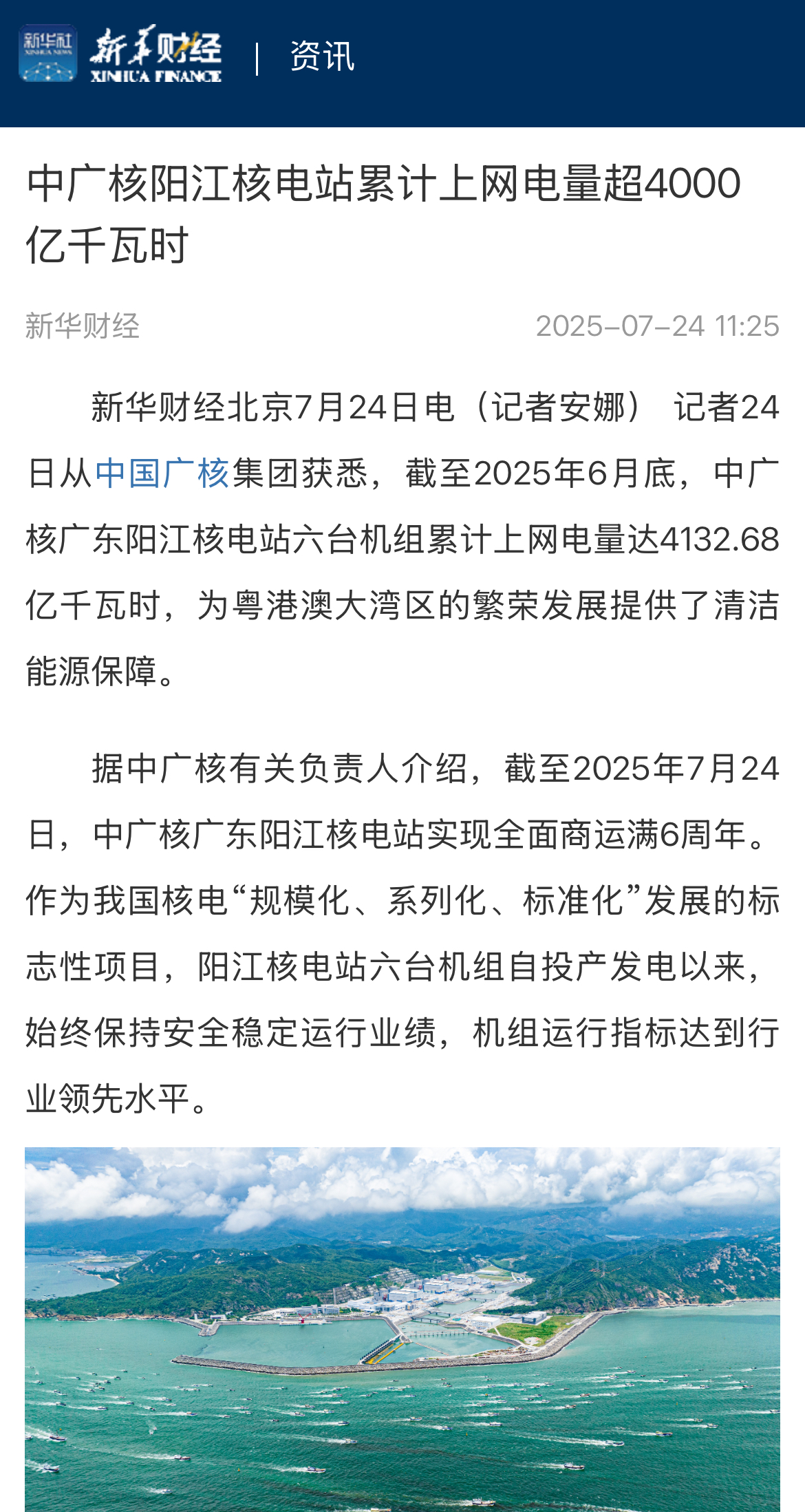 今年7月24日,阳江核电迎来了6台机组全面商运6周年,全基地6台机组实现累计上网电量超4000亿度,人民日报、新华社、央广网、科技日报、中新网等超20家主流媒体以《广东阳江核电站全面商运6年 上网电量累计超4000亿度》《阳江核电站全面商运6周年 上网电量累计超4000亿度》等为题,进行聚焦报道。