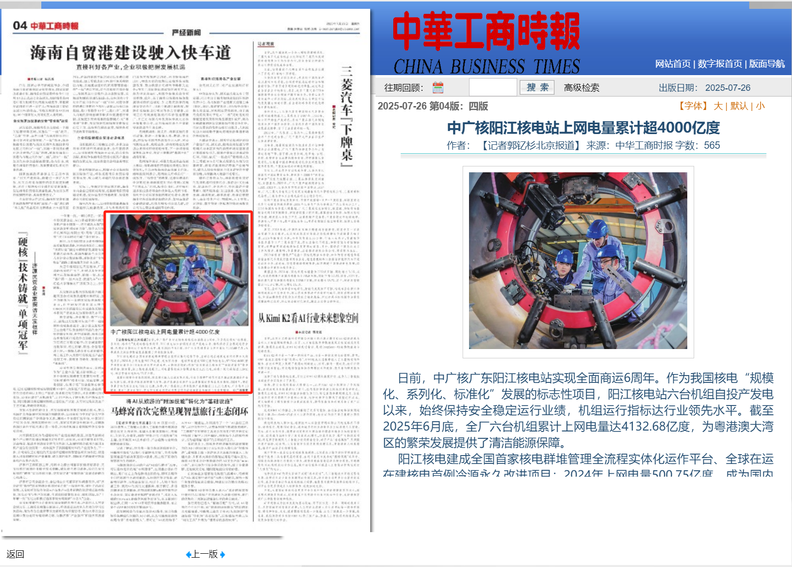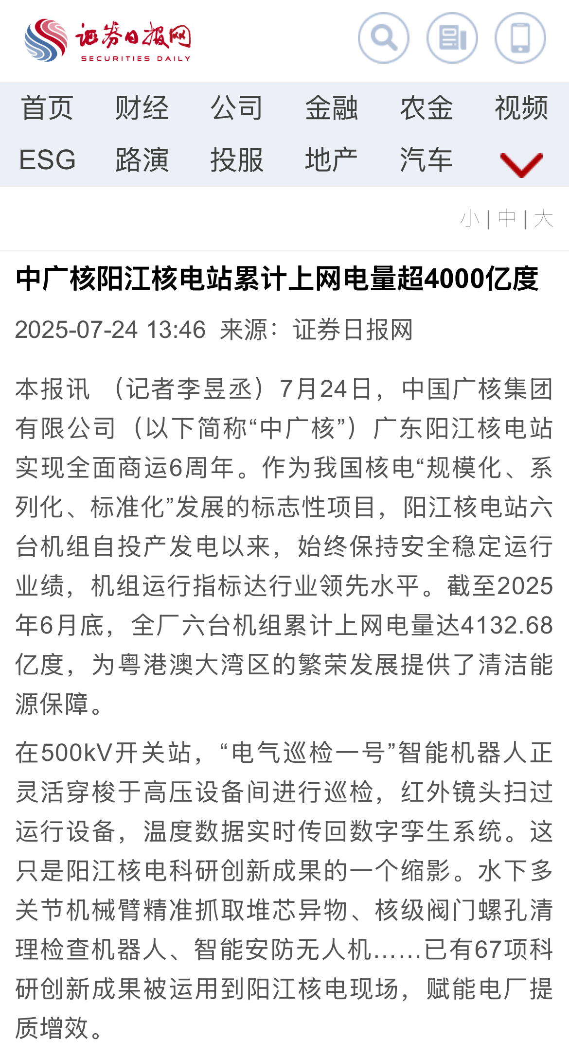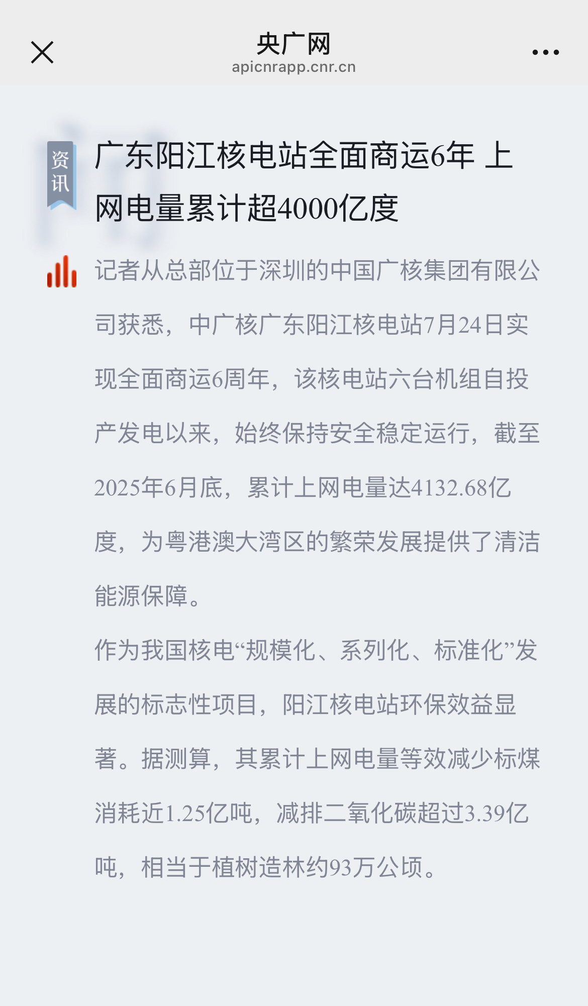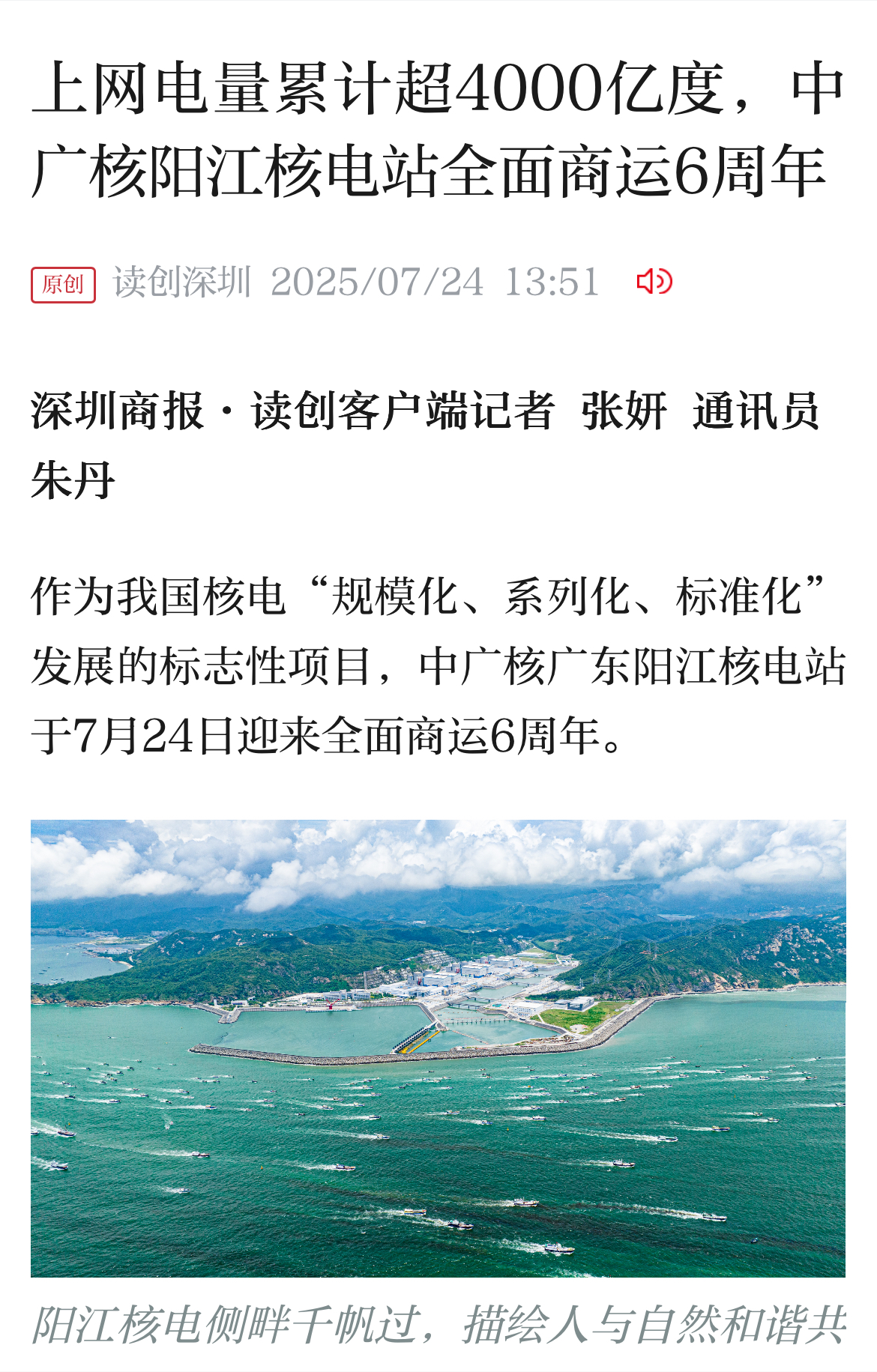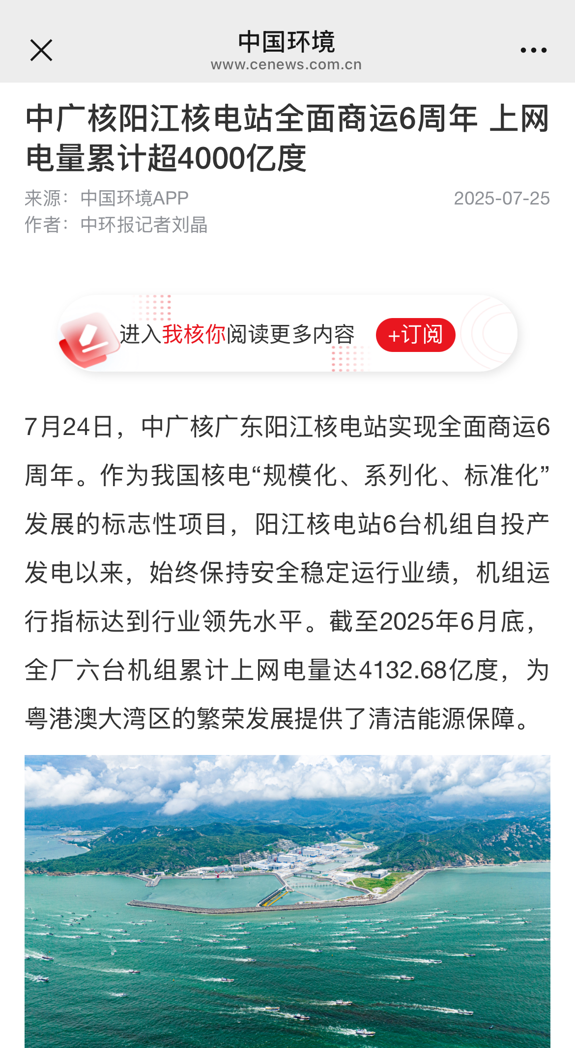 今年7月24日,阳江核电迎来了6台机组全面商运6周年,全基地6台机组实现累计上网电量超4000亿度,人民日报、新华社、央广网、科技日报、中新网等超20家主流媒体以《广东阳江核电站全面商运6年 上网电量累计超4000亿度》《阳江核电站全面商运6周年 上网电量累计超4000亿度》等为题,进行聚焦报道。